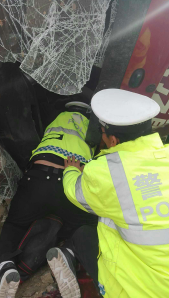 到達(dá)現(xiàn)場(chǎng),車輛駕駛室已嚴(yán)重變形車門無(wú)法打開(kāi),車上人員被困車內(nèi),且車上的燃?xì)膺€在“哧哧”地向外泄漏。為防止泄漏的天燃?xì)庥龌鸢l(fā)生爆炸,韓立一副中隊(duì)長(zhǎng)對(duì)現(xiàn)場(chǎng)施救工作進(jìn)行了仔細(xì)研究并明確分工,一組民警負(fù)責(zé)對(duì)事故現(xiàn)場(chǎng)道路進(jìn)行封閉,疏散圍觀人員提醒群眾嚴(yán)禁使用明火。另一組民警負(fù)責(zé)事故現(xiàn)場(chǎng)勘查取證和救助傷者。為盡快救出被困傷者,民警決定撬開(kāi)車輛前擋風(fēng)玻璃將被困人員救出,此時(shí)的車輛擋風(fēng)玻璃由于事故撞擊已經(jīng)破碎,民警利用現(xiàn)場(chǎng)鐵棍同好心群眾們一起在車輛擋風(fēng)玻璃上開(kāi)辟出一條救援通道,在民警和好心群眾的共同努力下,經(jīng)過(guò)1個(gè)小時(shí)的緊張營(yíng)救被困車內(nèi)傷者被成功救出并送往醫(yī)院進(jìn)行救治。