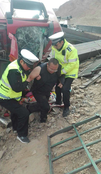 2017年11月11日12時(shí)許,阿拉善阿左旗公安局交警大隊(duì)蘇宏圖中隊(duì)值班民警接到公安局指揮中心指令稱:在阿左旗境內(nèi)S312線309公里處一輛號(hào)牌為冀B1916A重型半掛牽引車發(fā)生側(cè)翻,造成駕駛?cè)思俺塑嚾吮焕г谲噧?nèi),車上燃?xì)獍l(fā)生泄漏,要求立即處警。警情就是命令,蘇宏圖中隊(duì)立即啟動(dòng)交通事故緊急救援預(yù)案,副中隊(duì)長(zhǎng)韓立一迅速帶值班民警火速趕赴事故現(xiàn)場(chǎng)進(jìn)行救援工作,并撥打了120。