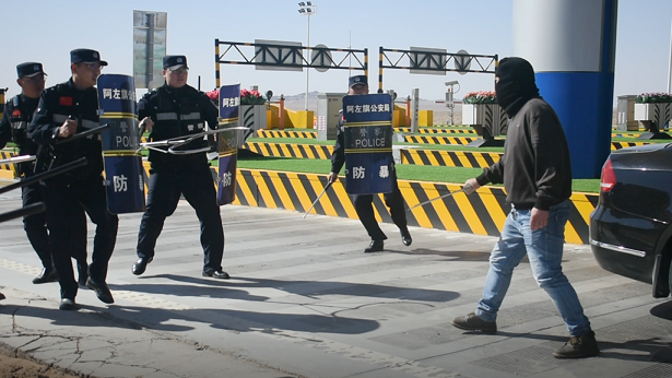 進(jìn)入吉蘭泰派出所,我們是帶了拍攝的任務(wù),為派出所做一期“大學(xué)習(xí)、大提升、大比武”主題的反恐演習(xí)教學(xué)片,地點(diǎn)就在京新高速收費(fèi)站。在吉蘭泰境內(nèi),京新高速公路共有83公里,自2017年通車以來,便成為吉蘭泰警務(wù)工作的重點(diǎn),本次反恐演習(xí)也是進(jìn)一步細(xì)化所隊(duì)聯(lián)勤、警企聯(lián)動(dòng)的應(yīng)急處突策略。題材的新穎讓我們來了興致,抵達(dá)目的地便開始了緊鑼密鼓的拍攝。演習(xí)中派出所所長(zhǎng)陳剛扮演了綁匪的角色,一個(gè)黑色的面罩,一把被細(xì)致封刃過的匕首,架著人質(zhì)喊出惡狠狠的臺(tái)詞,教學(xué)片頓時(shí)有了警匪片的效果。讓我不禁細(xì)致觀察著這位所長(zhǎng),一米八的瘦高個(gè),戴著眼鏡斯斯文文的,怎么就輕松駕馭了“持刀劫匪”的兇悍形象呢?果然,在他和教導(dǎo)員謝永偉的組織帶領(lǐng)下,演習(xí)團(tuán)隊(duì)相互配合,各個(gè)角色演繹的惟妙惟肖。劫持人質(zhì)、先期處警、調(diào)整策略、團(tuán)隊(duì)作戰(zhàn)、強(qiáng)力控制、制服劫匪……,每個(gè)人都全神貫注,盡力將可能遇到的問題集中表現(xiàn)精準(zhǔn),我想這就是他們平時(shí)工作的積累了。