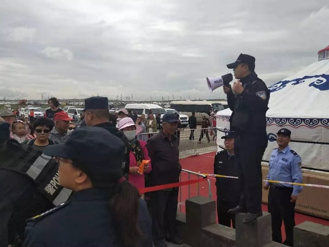 為確保活動順利進行,阿拉善公安提前謀劃,精心組織,本著安保無小事的理念,對每個環(huán)節(jié)、每個細節(jié)都進行了詳細部署和周密安排,全體參戰(zhàn)民警以高度的政治責任感和工作緊迫感投入安保工作,恪盡職守,全力奮戰(zhàn)在一線執(zhí)勤崗位,守護著平安,維系著和諧。一抹抹流動的警藍,一個個平凡的身影,在五彩繽紛的藝術節(jié)現(xiàn)場連成了一道道警徽閃耀的安保風景線。本屆藝術節(jié)開幕式規(guī)格高、規(guī)模大,開放式的演出會場為安全保衛(wèi)工作增加了巨大的壓力。在藝術節(jié)開幕前期,阿拉善盟公安局黨委高度重視,成立了安全保衛(wèi)工作領導小組,成員涉及盟公安局交警、治安各警種部門和各旗區(qū)公安局,副盟長、盟公安局黨委書記、局長賈境文帶領相關業(yè)務部門負責人多次到實地進行指導,對安保實戰(zhàn)、臨戰(zhàn)、決戰(zhàn)工作作出部署指導。