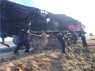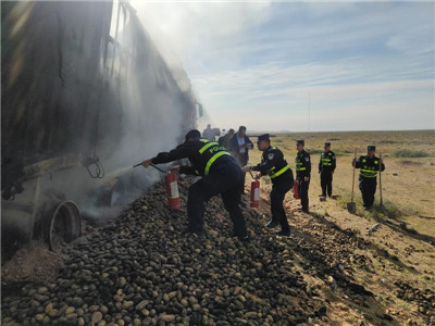 警情就是命令,民警們立即放下手中的工作,準(zhǔn)備滅火救援設(shè)備,于第一時(shí)間趕往現(xiàn)場。到達(dá)后,民警們看到現(xiàn)場濃煙滾滾、火光四濺,一輛半掛車的尾部輪胎正在燃燒,同時(shí)現(xiàn)場還有其他車輛“冒險(xiǎn)”經(jīng)過。隨后民警馬上分成3組投入戰(zhàn)斗。第一組2名民警立即封鎖道路,防止其他車輛進(jìn)入火場;第二組3名民警攜帶滅火器對明火進(jìn)行撲滅;第三組4名民警在明火撲滅后,隨即沙土掩埋的方式對著火部位進(jìn)行覆蓋,防止死灰復(fù)燃。經(jīng)過2個(gè)小時(shí)的連續(xù)作戰(zhàn),火情得以有效控制。