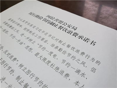 為認(rèn)真貫徹落實習(xí)近平總書記對制止餐飲浪費行為的重要指示精神,監(jiān)督辦制定《阿拉善盟公安局厲行勤儉節(jié)約制止餐飲浪費承諾書》,從“崇尚節(jié)儉,反對浪費”“取之有度,用之有節(jié)”“克勤克儉,艱苦奮斗”“移風(fēng)易俗,勤儉持家”“綠色低碳,簡約適度”五個方面,教育引導(dǎo)全體民警輔警要培養(yǎng)勤儉節(jié)約之風(fēng),倡導(dǎo)勤政廉政之風(fēng),進(jìn)一步樹立“節(jié)約一度電、節(jié)約一滴水、節(jié)約一張紙、節(jié)約一升油”思想,最大限度杜絕浪費。