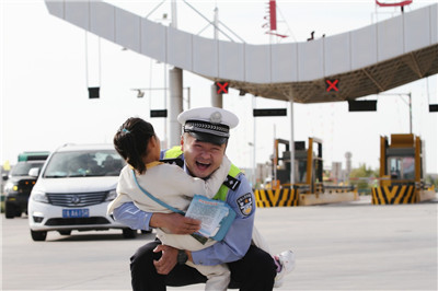 此刻,想念爸爸的女兒朱寶希偷偷來到了執(zhí)勤點,對著正在執(zhí)勤的朱有濤大喊了一聲:“爸爸,我來啦!”朱有濤一轉(zhuǎn)身,女兒已沖進了他的懷抱。瞬間,他的臉上樂開了花,心里別提有多開心。女兒緊緊抱住爸爸,生怕爸爸再一次因為工作忙碌又離開了她,現(xiàn)場的執(zhí)勤民警無不為之動容。同時,也想起了自己的孩子,為每逢節(jié)假日都在執(zhí)勤崗上不能陪伴家人而感到愧疚和難過。