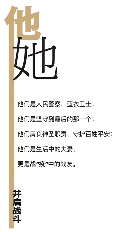 疫情就是命令,疫情就是警情。作為雙警夫妻和“戰(zhàn)疫夫妻”,楊靜和張飛龍以高度的政治責任感和使命感奮戰(zhàn)在疫情防控的工作崗位上,為守衛(wèi)人民群眾的生命健康和社會穩(wěn)定貢獻著自己的力量,疫情在前、警察不退,他們用自己的“最美逆行”,踐行著人民警察的初心和使命。