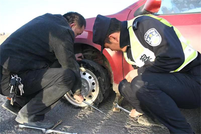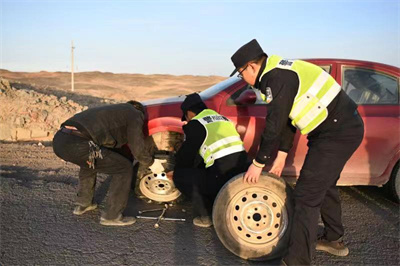 當日傍晚,民警在外出走訪途中,在嘉黑公路232公里處,發(fā)現(xiàn)一輛紅色小轎車??吭诼愤叄幻境巳藛T焦急地張望,等待攔截過往車輛。民警當即下車了解情況。原來,司機張某為額濟納旗黑鷹山某礦區(qū)卡車司機,其卡車發(fā)生故障,因此開著轎車前往甘肅購買配件,沒想到返回途中,其駕駛的車輛左前輪被尖銳石子刺破引發(fā)爆胎,但是苦于轎車沒有攜帶隨車工具,無法自行換裝備胎。同時,出事路段為無人區(qū)和信號盲區(qū),無法有效尋求救援,因此其在凜冽寒風中已經(jīng)等待2個小時。了解完情況后,民警們立即取下千斤頂?shù)染仍ぞ?,前后只用了不?0分鐘的時間便幫助其更換完了備胎。看到車輛終于可以行駛,張某感激地握著民警的手,一個勁兒地表達著謝意。