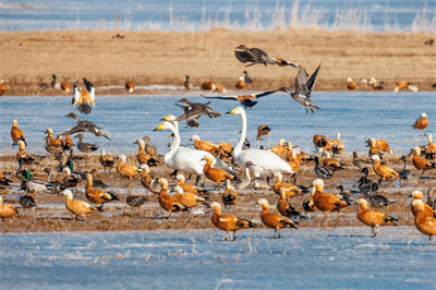 進入3月以來,在托克托縣黃河濕地內(nèi),已經(jīng)有200余種候鳥在此處棲息停留。成群結(jié)隊的天鵝、鴻雁、赤麻鴨等各種珍稀鳥類,時而三五成群、展翅翱翔,時而戲水游玩、引吭高歌,展現(xiàn)出了濕地特有的生態(tài)畫卷。