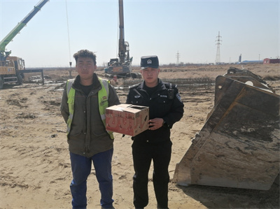 施工現(xiàn)場,工人將一只受傷的貓頭鷹交給派出所民警。(攝影:王軒)
