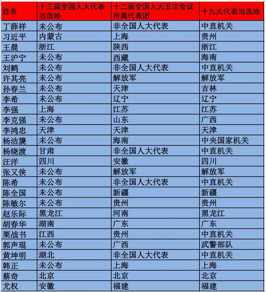 再看7位常委去年當選十九大代表的情況:習近平在貴州當選,李克強在廣西當選,栗戰(zhàn)書在中直機關當選,汪洋在四川當選,王滬寧在海南當選,趙樂際在黑龍江當選,韓正在上海當選。
