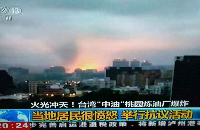 ▲ “火光沖天!”央視報道煉油廠爆炸,先是極盡渲染,接著又說“居民很憤怒”。我大吃一驚,這不符合央視風格啊,仔細一看,原來是說臺灣。