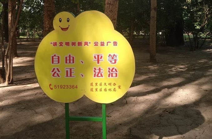 ▲ 和朋友在公園聊天散步,他問怎么界定正能量和負能量。我說,要辯證地看,不能一概而論。比如這個牌子,放在這里是正能量,舉起來在街上走一圈就是負能量。
