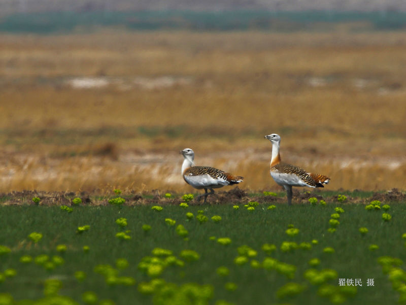 在先期燒過的草原上,已經(jīng)長出了綠草和狼毒花。這兩只大鴇在綠地的周邊徘徊,也許它們在考察,將來這里能否成為它們新的求偶地。