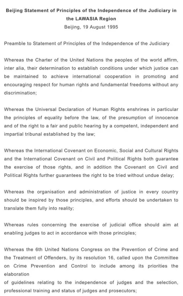 那1995年簽署的什么《關于司法獨立的宣言》是怎么回事?其實那個文獻的準確翻譯是《關于司法機關獨立的基本原則》,根本就沒有“司法獨立”的字眼。一些公知夾帶私貨,自己把它翻譯成了《關于司法獨立的宣言》。我的證據(jù)是,這個由亞太地區(qū)三十多個國家最高法院在北京簽署的宣言,原文并沒有提司法獨立(judicial independence),而是用的司法機關獨立(Independence of the Judiciary)。再看內(nèi)容,規(guī)定的是司法機關應該在公正地分析事實和理解法律的基礎上依法審理案件,而不應該受到其他任何因素直接或者間接的影響;司法機關對一切具有司法性質(zhì)的問題,享有司法管轄權……這其實與我國的“確保依法獨立公正行使審判權檢察權”并無矛盾。