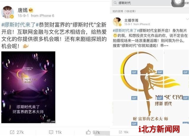 唐嫣、李湘、瞿穎、鐘麗緹、胡靜5大女神都在微博幫忙推廣e租寶理財(cái)平臺“繆斯時代”。