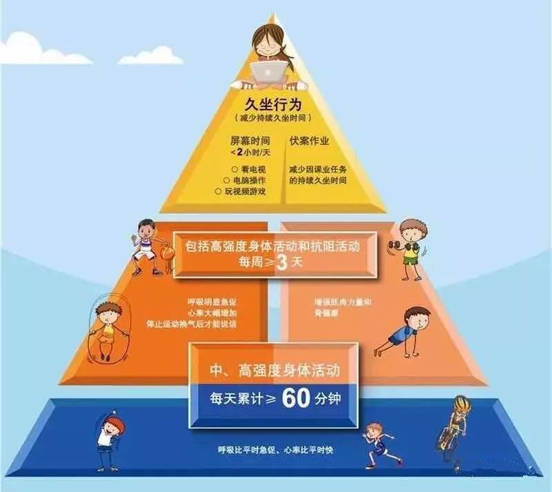 兒童和青少年每日應(yīng)至少累計60分鐘的中高強(qiáng)度身體活動,包括每周至少3天的高強(qiáng)度身體活動和增強(qiáng)肌肉力量、骨骼健康的抗阻活動。