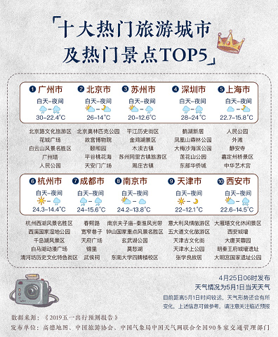 廣州將成為今年五一小長(zhǎng)假最熱門的出游目的地城市。其他位列前十的熱門旅游城市,依次是北京、蘇州、深圳、上海、杭州、南京、成都、天津、西安。蘇州超越深圳、上海,列第三位,成為超大城市之外,最受歡迎的旅游城市。