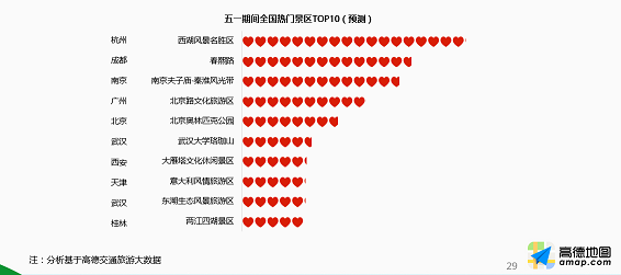 景區(qū)方面,杭州西湖將成為五一出游最熱目的地,成都春熙路、南京夫子廟秦淮風(fēng)光帶熱度分居第二、三位,其他最熱TOP10景區(qū)依次是廣州北京路、北京奧林匹克公園、武漢珞珈山、西安大雁塔、天津意大利風(fēng)情旅游區(qū)、武漢東湖以及桂林兩江四湖景區(qū)。