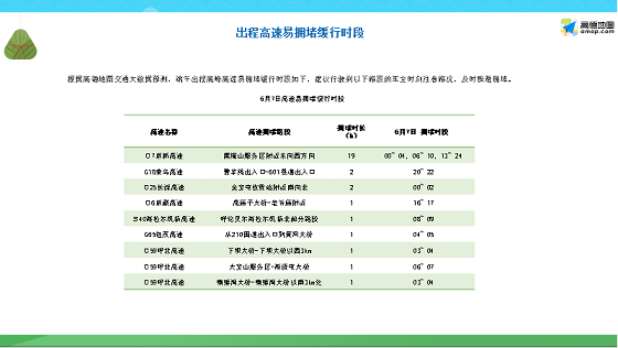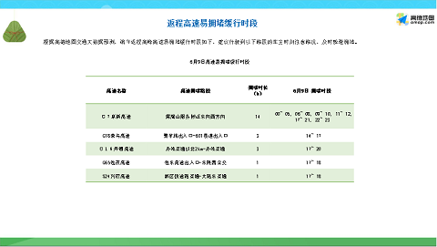 根據(jù)高德地圖交通大數(shù)據(jù)預(yù)測(cè),端午出程高峰高速易擁堵緩行時(shí)段如下,建議行駛到以下路段的車主時(shí)刻注意路況,及時(shí)躲避擁堵。
