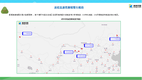 根據(jù)高德地圖交通大數(shù)據(jù)預(yù)測(cè) ,端午期間內(nèi)蒙古自治區(qū)返程易擁堵緩行的高速有G7京新高速、G18榮烏高速、G16丹錫高速等高速的部分路段。