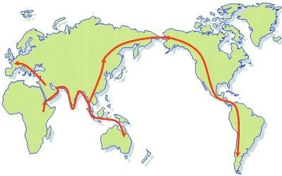 約4.5萬年前進(jìn)入歐洲 約10萬-7萬年前走出非洲 約2萬-1.5萬年前進(jìn)入北美洲 約5萬年前到達(dá)澳大利亞 約1.5萬年前到達(dá)南美洲 早期現(xiàn)代人的遷徙路線示意圖。