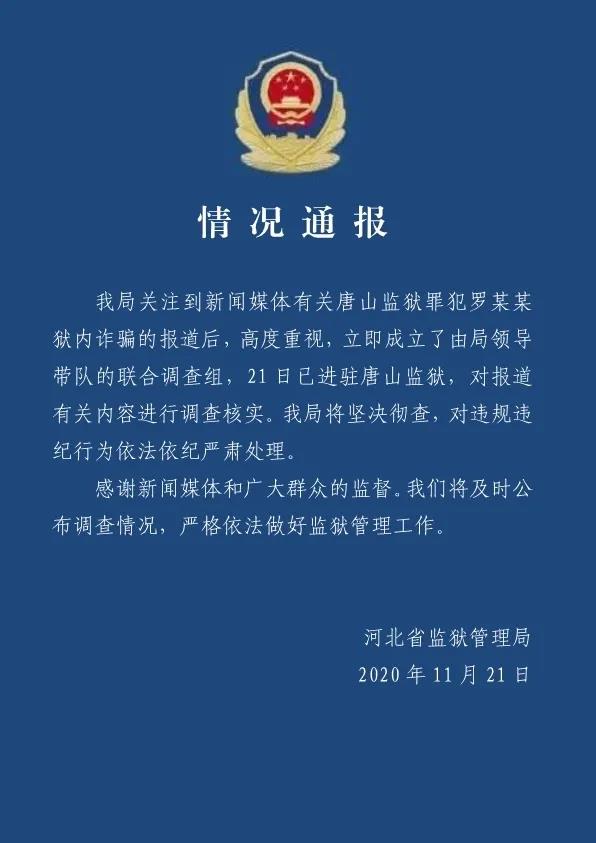 日前,河北省監(jiān)獄管理局發(fā)布情況通報稱,該局關(guān)注到新聞媒體有關(guān)唐山監(jiān)獄罪犯羅某某獄內(nèi)詐騙的報道后,高度重視,立即成立了由局領(lǐng)導(dǎo)帶隊的聯(lián)合調(diào)查組,21日已進駐唐山監(jiān)獄,對報道內(nèi)容進行調(diào)查核實。