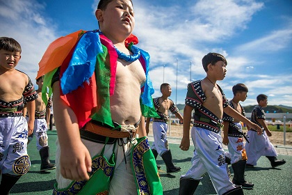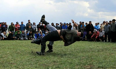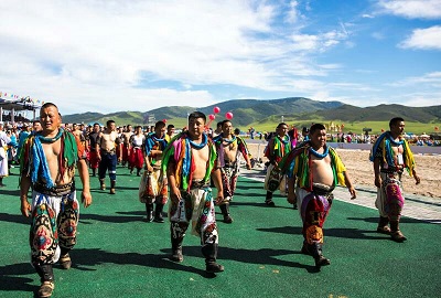 摔跤比賽是那達(dá)慕的重頭戲,健壯的蒙古漢子個個都是摔跤手??粗鳖i上套著五彩韁嘎,穿著不同級別摔跤服的跤手,跳著粗獷奔放的鷹舞進(jìn)入摔跤場時(shí),立刻引來大批的觀眾圍成一圈,為自己喜歡的跤手加油助威!