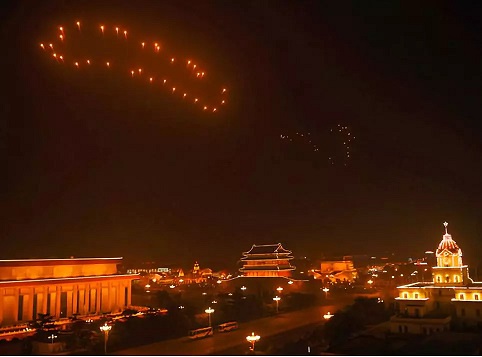 2008年8月8日晚,北京奧運(yùn)會(huì)開幕式燃放焰火《歷史足跡》。這是在天安門廣場(chǎng)上空拍攝的“腳印”。新華社發(fā)