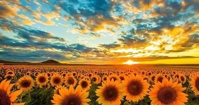 從未見過的“金葵圖”——遠方地平線,萬縷金霞光;葵田連天涌,芳華仰面香。鏡頭把遙遠“拉”至近前,同時“推”出金葵,一而二、二而三,達于無限,似得《易經(jīng)》變化之精髓;“何方可化身千億?一株葵花一放翁”,又具陸放翁的家國情懷?;秀敝?,一盤金葵一張笑臉,農(nóng)人皆為豐收而樂;一朵葵花一葉金輪,農(nóng)村渴望振興而動;一輪葵盤一輪太陽,農(nóng)業(yè)飽蘊能量而興。天光染霞彩,云影散晴嵐,美輪美奐中陶醉了呼和馬場草原上的大黑山,青蔥歲月時的葵葉,盡情綻放黑土地的躁動和可持續(xù)聚變的潛能……