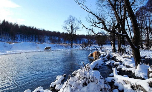 回到“大片”上來,只見浮泛著青光黛影的基調(diào)中透著寒意;“蓄芳待來年”的山林與岸樹,靜默無語;水在流淌,波紋舒卷寫下生動的證明;水溫幾度?為何能在高寒山區(qū)的深冬季節(jié)“活潑”如此?極度懸疑中,畫面上一遠一近兩頭當?shù)攸S牛竟然涉水覓食,旁若無人地(岸邊沒有放牧者)、悠然自得地(自己家的“草庫倫)、從容不迫地(無絲毫冷凍感),在水里大快朵頤,吃飽了、喝足了“回家休息”,日子過得真“?!薄?br />