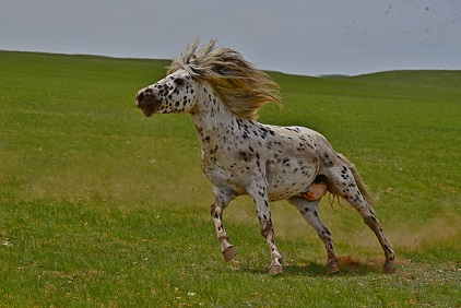 我當(dāng)初就有一匹這樣的馬。人稱"朝喝勒",意思是花馬,顏色偏粉紅,帶小白點兒。這要是衣料的花色,給年輕姑娘做裙子挺不錯,可一匹馬長成這副德行,像個舞臺上跳來跳去的小丑兒。模樣不濟(jì),本該溜邊兒老實呆著,這馬卻沒自知之明,偏是生性張揚,跑起來馬嚼子根本勒它不住,大張嘴,高昂頭,打著響鼻,一個勁往前躥,以它的"黑胎"進(jìn)一步惹人嫌。