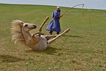 沒多久,這貨已不必用馬絆子,只用馬籠頭隨便拴住一條腿兒,就知道乖乖圍著蒙古包兒吃草,它似乎沒跑回馬群去的愿望,就想守著主人過一輩子了。把它放歸馬群,想用的時候,也不需用套馬桿套,只沖它拿桿子一比畫,立時就能立定稍息。