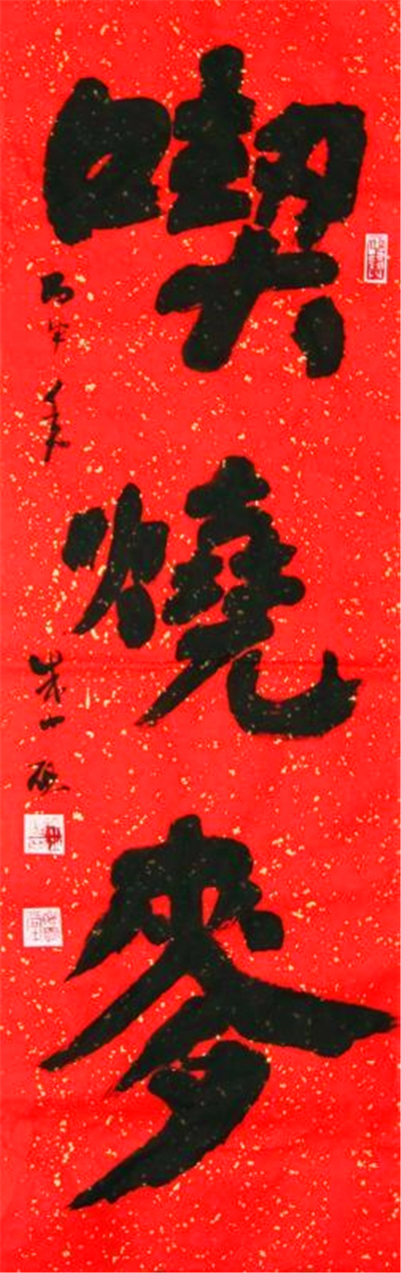 當(dāng)然審美角度不一樣,也許說(shuō)顏真卿的字雄強(qiáng)有力的特征,不入大雅之堂,有俗氣之嫌。這也是一個(gè)特征,因此我選擇顏真卿的字作為創(chuàng)作手段,通俗易懂和老百姓沒(méi)有距離感,尤其吃燒麥本身是街頭小巷常見(jiàn)的民間習(xí)俗,為了體現(xiàn)這一點(diǎn),所以在書(shū)法創(chuàng)作上,選擇了顏真卿的字體。