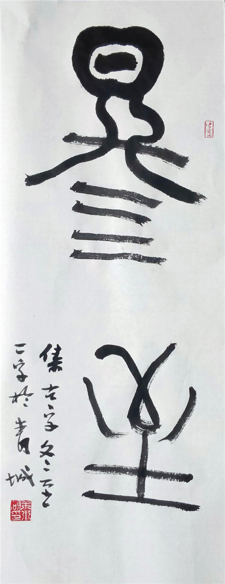 書法中“冬至”二字集古文字而成,古文字一般除了專門從事這方面學習和研究的人以外,普通人是很難認識的。利用古文字作為書法創(chuàng)作載體,讓人感到似懂非懂的文字和詩中“問君哪個解其中”的詩境不期而然達到一致。