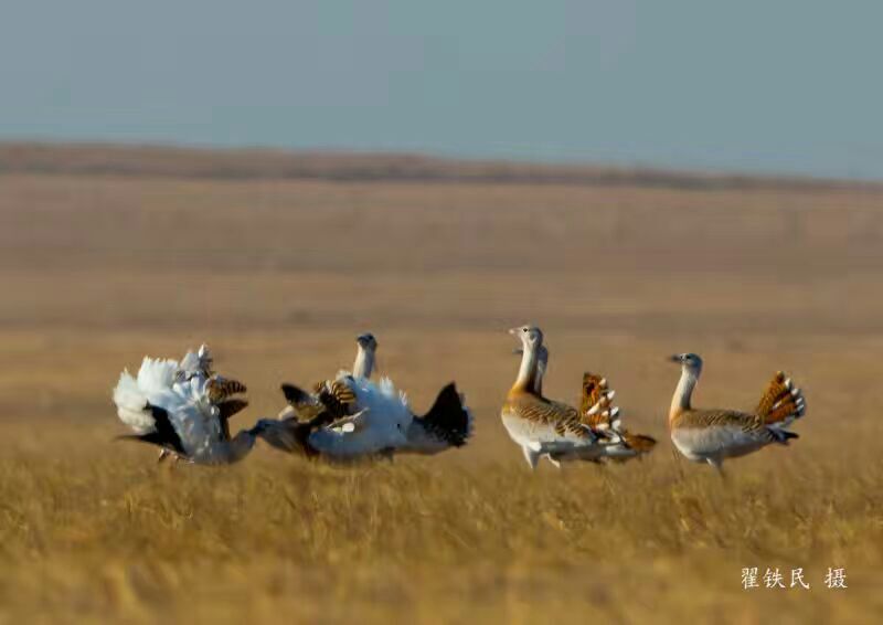 陽(yáng)春三月,乍暖還寒,科爾沁草原依然是一片冬季殘留的枯黃景色,偶有被野火燒過(guò)的成片草場(chǎng)微微泛青。每到早晨,初升的太陽(yáng)光線平射,穿透力很強(qiáng)。從蒙古高原流涌而來(lái)的一股股清流,與夜晚地面上的霜凍凝固成薄霧狀,在晨光的映射下顯得曼妙神奇。千里之內(nèi),除了遠(yuǎn)處的嘀嗒嘀嗒馬蹄聲,便是這站在樁上的百靈鳥們毫無(wú)倦怠的鳴春曲了。如此愜意、如此清爽與靜謐,促使早期來(lái)到繁殖地的大鴇較其它一些鳥類提前進(jìn)入發(fā)情期。這個(gè)時(shí)候的大鴇很喜歡聚群。常見幾只雄鳥影隨一起,就像是同性戀人。而另外多只雌鳥和亞成鳥也于在不遠(yuǎn)處聚群,最大的鳥群有20幾只,估計(jì)它們都是在培養(yǎng)情趣,等待適時(shí)交配。此時(shí)大鴇的雄鳥和雌鳥一般不是在一起混群,但有時(shí)也會(huì)2群交織在一起。這是它們彼此間交流溝通的大好時(shí)機(jī)。因?yàn)檫^(guò)了這個(gè)交配的季節(jié),它們就要分道揚(yáng)鑣,雌雄分開,雌鳥則獨(dú)自去孵化和哺育后代了。