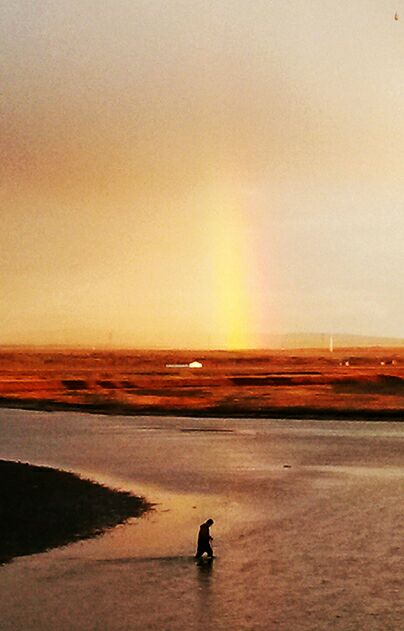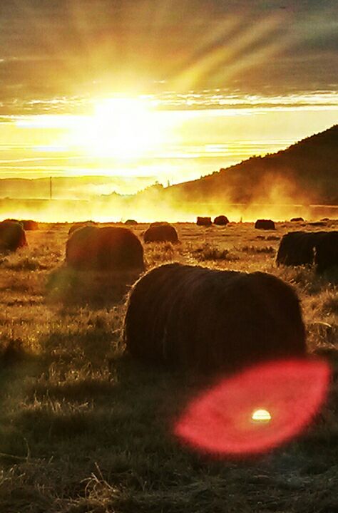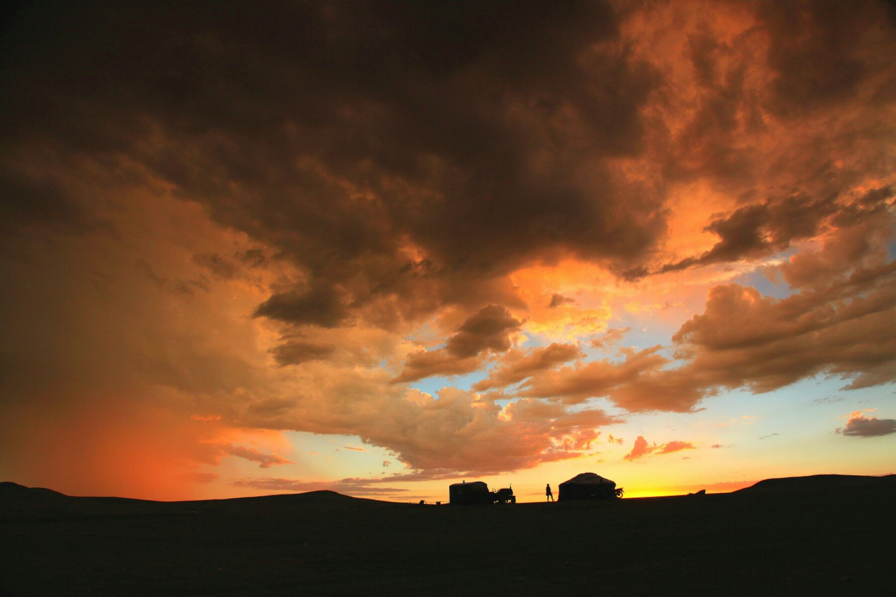 大雨過后,太陽的余暉照亮天空尚未散去的云,還有牧歸的人。
