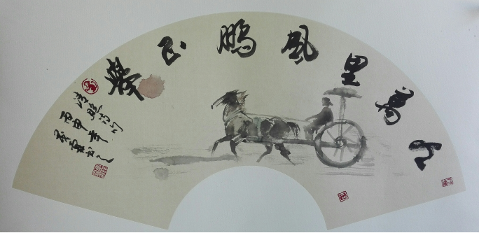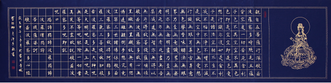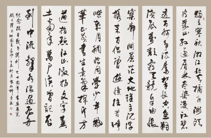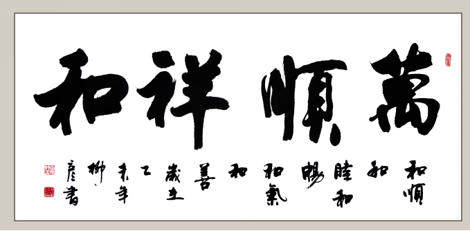 縱觀其書作,無論榜書巨幅、小楷宏篇、條屏手卷、斗方對聯(lián),或擘窠健筆,或蠅頭浩繁,或格言警句,或詩詞名篇,一經(jīng)妙筆點染,憑添神采萬千。譬如《萬順祥和》,筆墨飽滿圓潤,頗見顏筋歐體,“此卷在處,當(dāng)有祥云覆之”(借董其昌語)。又如《煙云入畫》,盡態(tài)極妍,動靜相宜,“云”飄逸而欲飛,“入”迅掠而馳驅(qū);無一字不富姿媚,無一筆不可人意。而斗方《浩然正氣》,筆力遒勁,使轉(zhuǎn)跌宕,勒行頓挫,側(cè)布險意,搖曳多姿,虛實成趣。橫幅之作雖眾,書來各有玄機(jī):若夫日華“吳山”,寓森嚴(yán)于縱逸,蓄凝重于蹈厲;至于張耒“春水”,通篇鋪衍瘦筆,偏以濃淡見奇;或有子昂“東城”,逞其清俊錯落,時見偃仰相揖;或有王冕“白梅”,筆疾徐而中節(jié),勢向背而韻余。及至六扇條屏,一騁偉人豪氣,集乎行草功力,變乎米王筆趣,書生意氣縱橫,激揚文字放逸;煙霏露結(jié),狀若斷而猶連;鳳翥龍翔,勢騰躍而逶迤。更有朱筆心經(jīng),盡顯真楷之功,結(jié)體端莊沉著,盎然顏歐質(zhì)形。倏而藍(lán)白易幅,新經(jīng)活潑輕靈;不用柳筆得其骨,化取趙韻行楷風(fēng);兼容魏碑同造化,博采眾長入一屏。