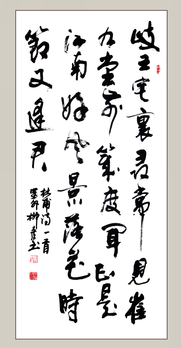 柳彥先生幾十年筆耕不輟,取法高古,博觀約取,深悟書道。逐步形成剛?cè)峒鏉?jì)、雄奇秀逸、率意灑脫的書風(fēng)。擅寫行草和榜書。他的作品多長參展并獲獎,也被許多中外友人收藏。