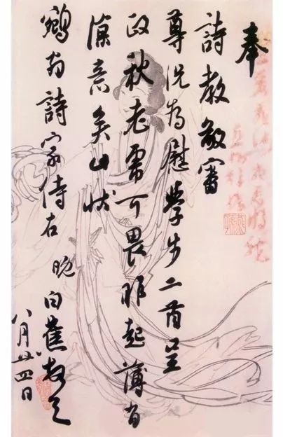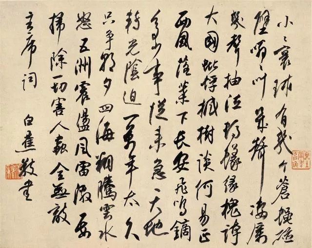 不光講字形用筆,還要看運(yùn)墨。(書譜》說:“帶燥方潤,將濃遂枯”。用墨不使單調(diào),也是矛盾統(tǒng)一。古時(shí)用墨,一般講,用濃的多。宋代蘇東坡用墨“須湛湛如小兒眼乃佳”,可見是用得較濃的。明代用墨有發(fā)展,董其昌善用淡墨。畫家用畫筆在畫幅上寫詩文題跋,蘸著濃就濃點(diǎn),蘸著淡就淡些,干就干些,寫來有奇趣。善用墨,墨淡而不滲化,筆干而能夠?qū)懴氯ァ?br />