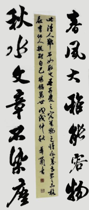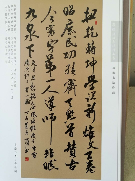“浩蕩深謀噴江海,縱橫義氣走風(fēng)雷”。用李白寫哥舒大夫的這兩句詩來形容世聞同志,我以為毫不為過。他工作在黨政機關(guān),精于思考、探索和研究,無私奉獻幾十年,鞠躬盡瘁,是黨的好干部,人民的好公仆。在書法創(chuàng)作上,他筆意勁古,點畫潑發(fā),縱橫如意,神采動蕩,是一位非常有潛力、有前途的書法家!