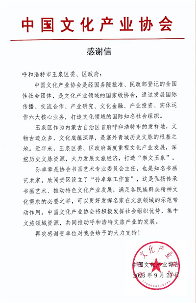 呼市玉泉區(qū)接受中國文化產(chǎn)業(yè)協(xié)會感謝信