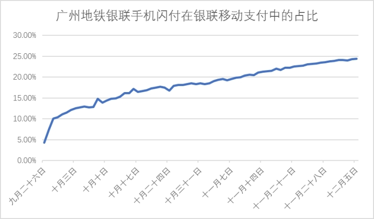 廣州地鐵銀聯(lián)閃付的最大優(yōu)勢(shì)在于直接過(guò)閘進(jìn)站。在廣州乘坐地鐵,用戶只需持有開(kāi)通銀聯(lián)手機(jī)閃付的手機(jī),或者帶有“閃付”標(biāo)志的銀聯(lián)信用卡,都可以 “一揮即付”過(guò)閘,不需要預(yù)先購(gòu)票或者充值,進(jìn)站效率大幅提升。值得一提的是,銀聯(lián)手機(jī)閃付由于無(wú)需攜帶銀聯(lián)卡,不用解鎖、不用打開(kāi)APP、不用點(diǎn)開(kāi)二維碼,指紋一鍵認(rèn)證、沒(méi)有多余驗(yàn)證環(huán)節(jié),更加快捷好用,受到廣大乘客的普遍青睞,因此占比不斷提高,短短兩個(gè)多月,已由9月底的5%快速上升至目前的24%,且領(lǐng)跑各類移動(dòng)支付方式。目前,用戶可通過(guò)“云閃付”APP或蘋(píng)果手機(jī)Wallet應(yīng)用開(kāi)通銀聯(lián)手機(jī)閃付體驗(yàn)廣州地鐵直接過(guò)閘。