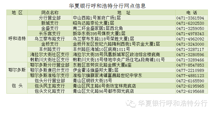 詳詢?nèi)A夏銀行各網(wǎng)點(diǎn)