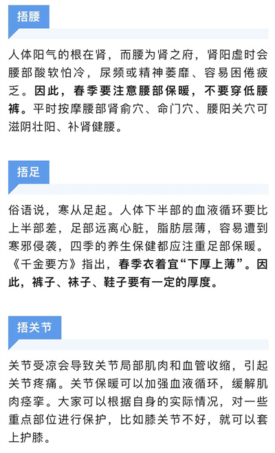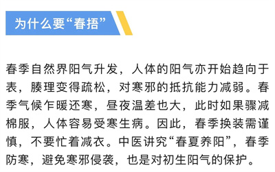 俗話說,春捂秋凍,百病難碰。這句俗語提示人們,春天剛到來時(shí)不要立即脫去冬裝,要適當(dāng)“捂一捂”,以防春寒;而到了秋天,也不要立即穿太多衣服,可以適當(dāng)“凍一凍”,以增強(qiáng)對(duì)冬寒的適應(yīng)性。