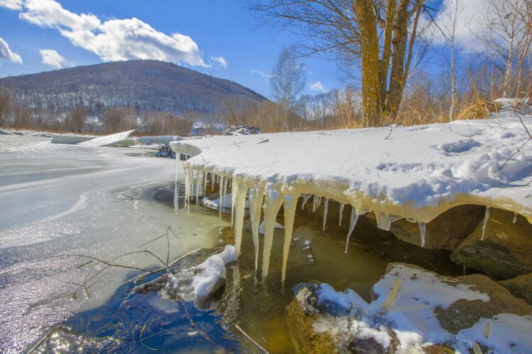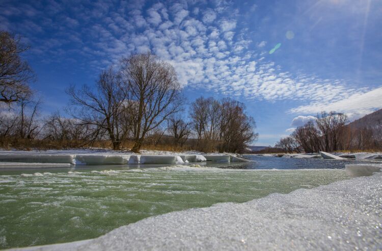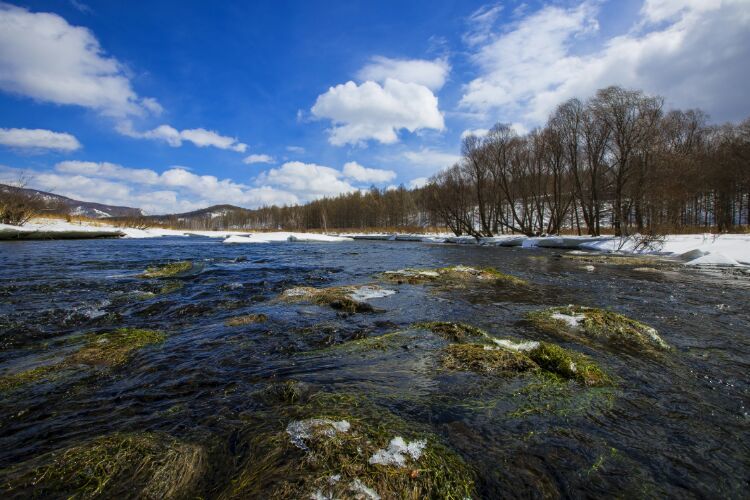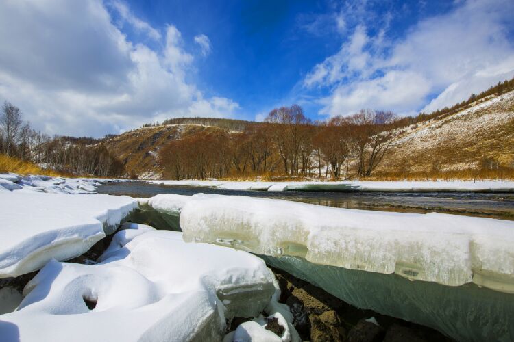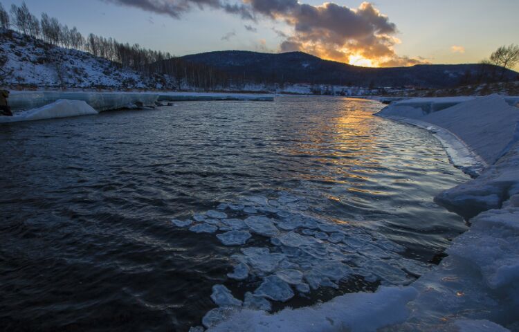 每進(jìn)初夏四、五月間,關(guān)內(nèi)早已是百花盛開(kāi),滿目蒼翠,而塞外邊關(guān)阿爾山卻剛剛冒出些春的氣息。你看那連綿的群山經(jīng)歷了秋冬的肅殺也漸漸泛起了春天的色彩。那如胭的紅色是紅毛柳在招搖,那青澀的新綠是落葉松在歌唱,那苗條白晰如少女身姿般的倩影是白樺林在抒情,而這曠野春情的一切一切,最讓我感動(dòng)最使我留戀的竟是這千古輪回的哈拉哈河融冰的場(chǎng)面??窗伞膳愕陌柹健?/span>