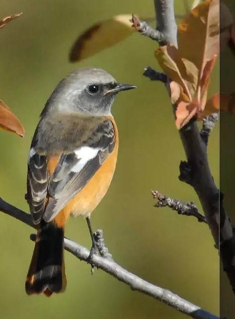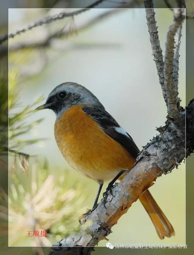 北紅尾鴝,Phoenicurus auroreus (Pallas, 1776),鶇科紅尾鴝屬的一種小型鳥類,體長13-15厘米。雄鳥頭頂至直背石板灰色,下背和兩翅黑色具明顯的白色翅斑,腰、尾上覆羽和尾橙棕色,中央一對尾羽和最外側一對尾羽外翈黑色。前額基部、頭側、頸側、頦喉和上胸概為黑色,其余下體橙棕色。雌鳥上體橄欖褐色,兩翅黑褐色具白斑,眼圈微白,下體暗黃褐色。 相似種紅腹紅尾鴝頭頂至枕羽色較淡,多為灰白色,尾全為橙棕色,中央尾羽和外側一對尾羽外翈不為黑色。無生存危機的物種。
