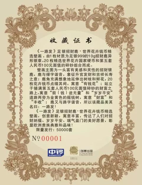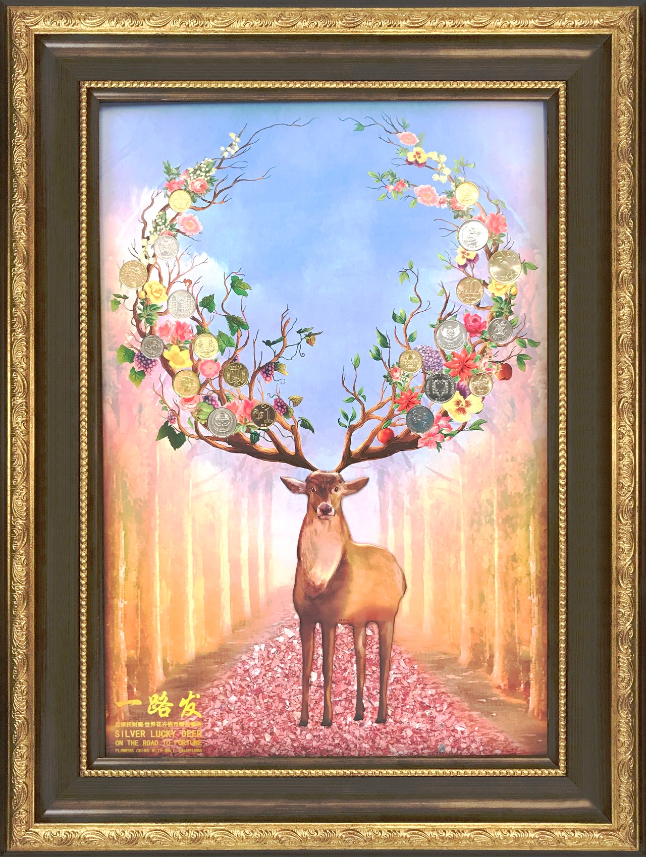 《一路發(fā)》足銀招財(cái)鹿·外幣壁畫,由1枚10g招財(cái)鹿異型銀章,20枚精選世界花卉外國硬幣,和第五套人民幣100元的碎鈔組合而成?;ɑ苠X幣巧妙地鑲嵌于鹿角延伸的鮮花之間,金碧輝煌,不僅象征世界財(cái)富,更以花卉錢幣隱喻“有錢花?!?br />