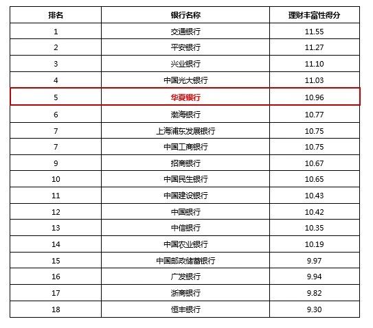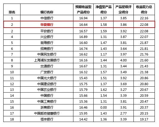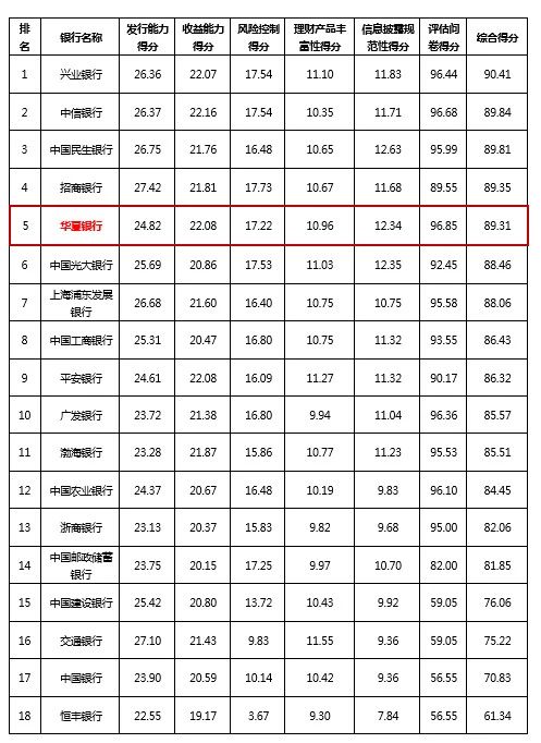 華夏銀行在綜合理財能力排名及收益能力、理財產(chǎn)品豐富性、信息披露規(guī)范性這三個單項評價中,均進入全國性商業(yè)銀行前5名。