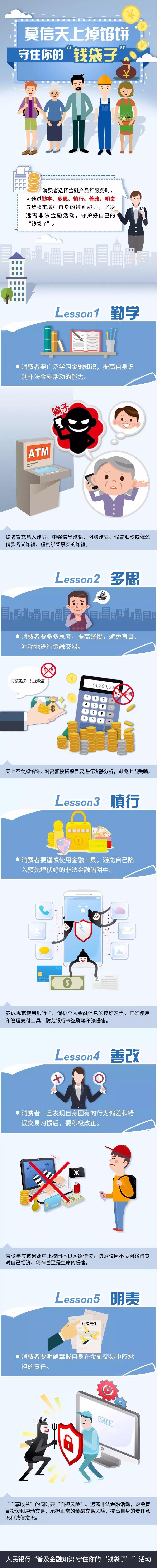 為進一步貫徹落實黨的十九大精神和習近平總書記的重要指示精神,幫助金融消費者運用正當途徑守護好自身的“錢袋子”,增強農(nóng)民、務工人員、青少年、老年人和殘疾人的金融知識與技能、風險識別與防范能力,抑制盲目投資沖動,遠離非法金融活動,人民銀行決定于2018年6月開展“普及金融知識,守住‘錢袋子’”活動。